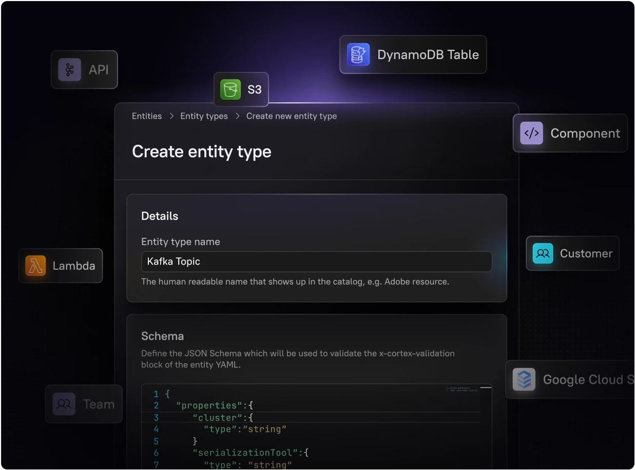 Design custom entity types with clear, consistent schemas so every resource has the right metadata, ownership, and context, by default.