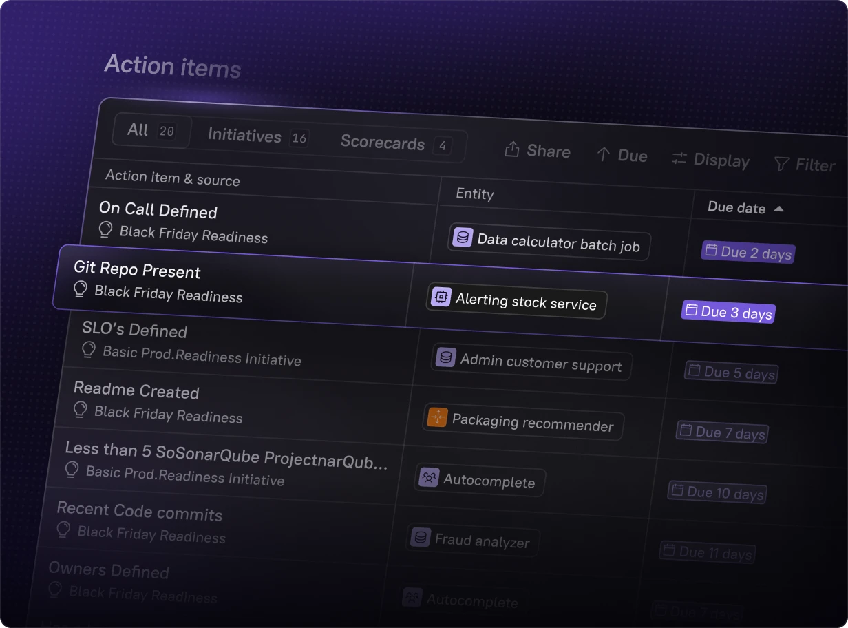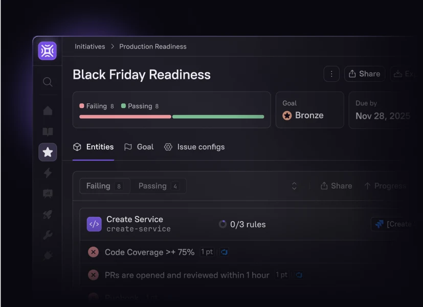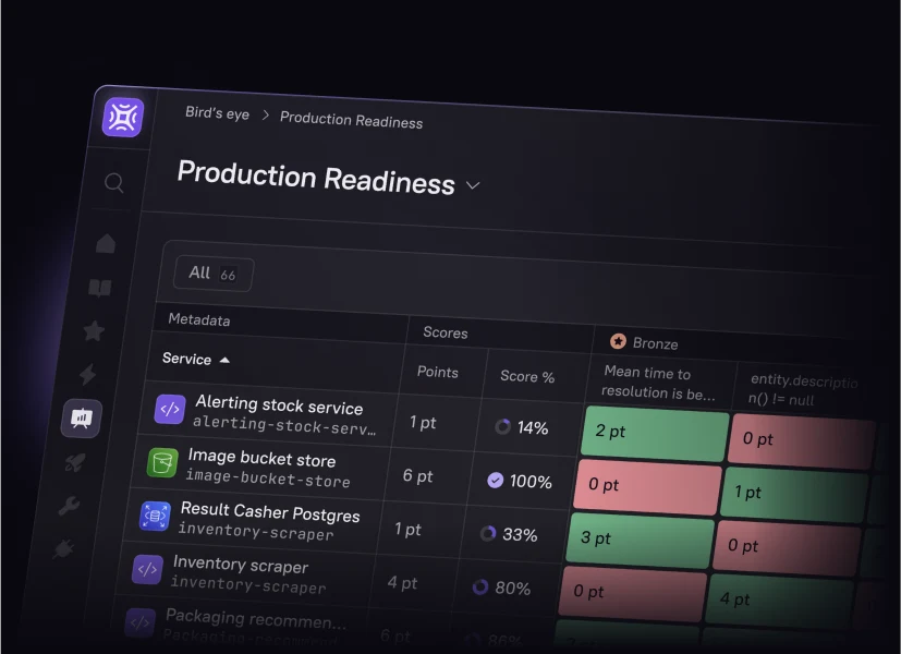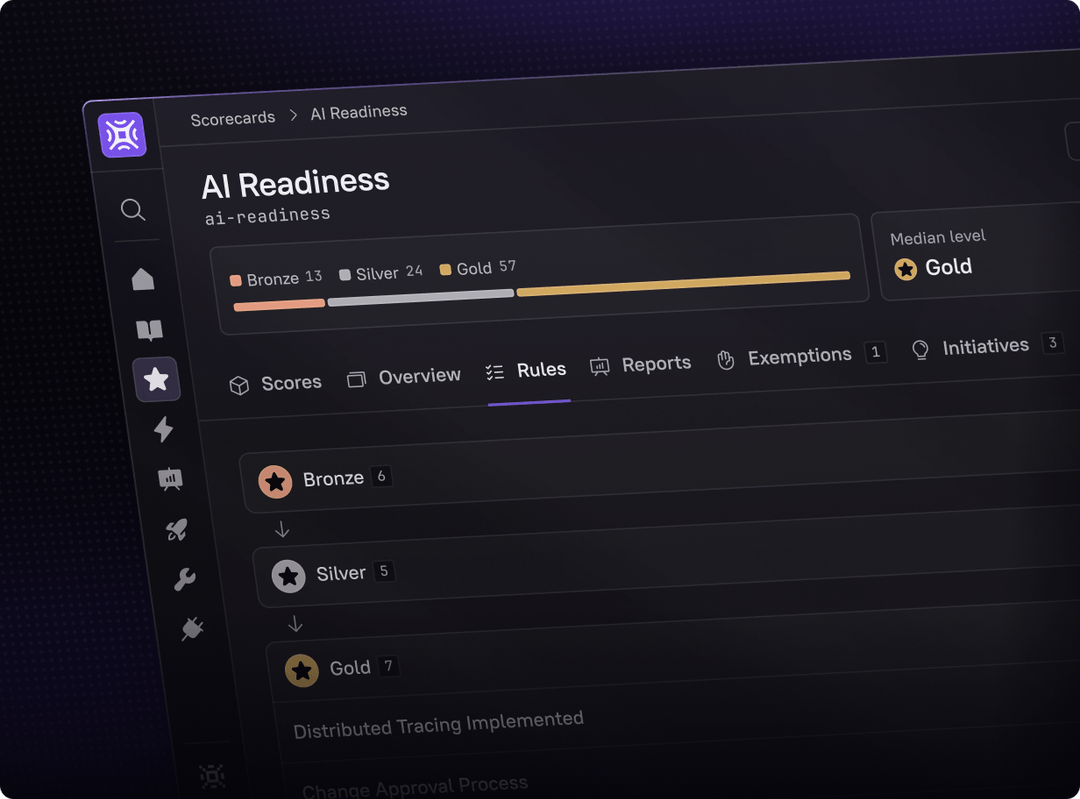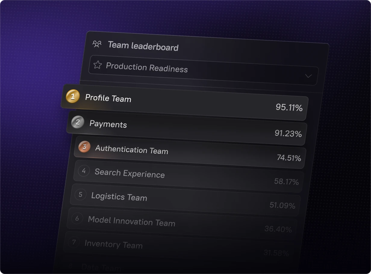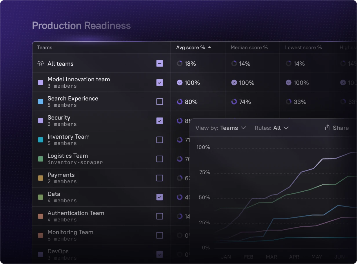 Build any Scorecard in minutes – from production readiness to security compliance to AI maturity. With data pulled automatically from your existing tools, it’s easy to define standards, track progress, and drive improvement across teams.